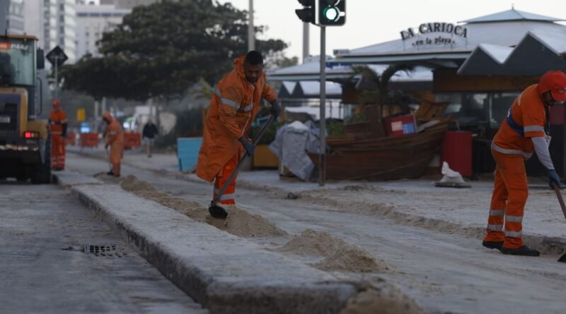 Equipes da Companhia de Limpeza Urbana (Comlurb) permanecem trabalhando na retirada da areia que atingiu as pistas da Avenida Delfim Moreira, no Leblon, zona sul do Rio de Janeiro, invadidas nesta terça-feira (29) pela força do mar. A ressaca que atingiu o litoral do estado é reflexo de um ciclone extratropical.